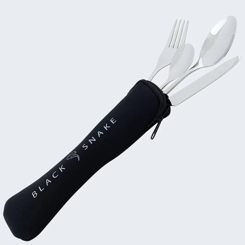 · couverts: fourchette, couteau, cuillÚre et cuillÚre à café incl. sac de rangement