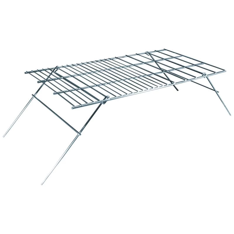 Grill en acier chromé pliable, parfait pour cuisiner avec des poêles sur un feu. 30x61cm.