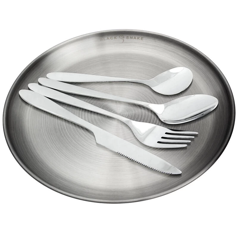 Assiette: 100% acier inoxydable; couverts: 100% acier AISI 410; sac de rangement couverts: 100% polyester